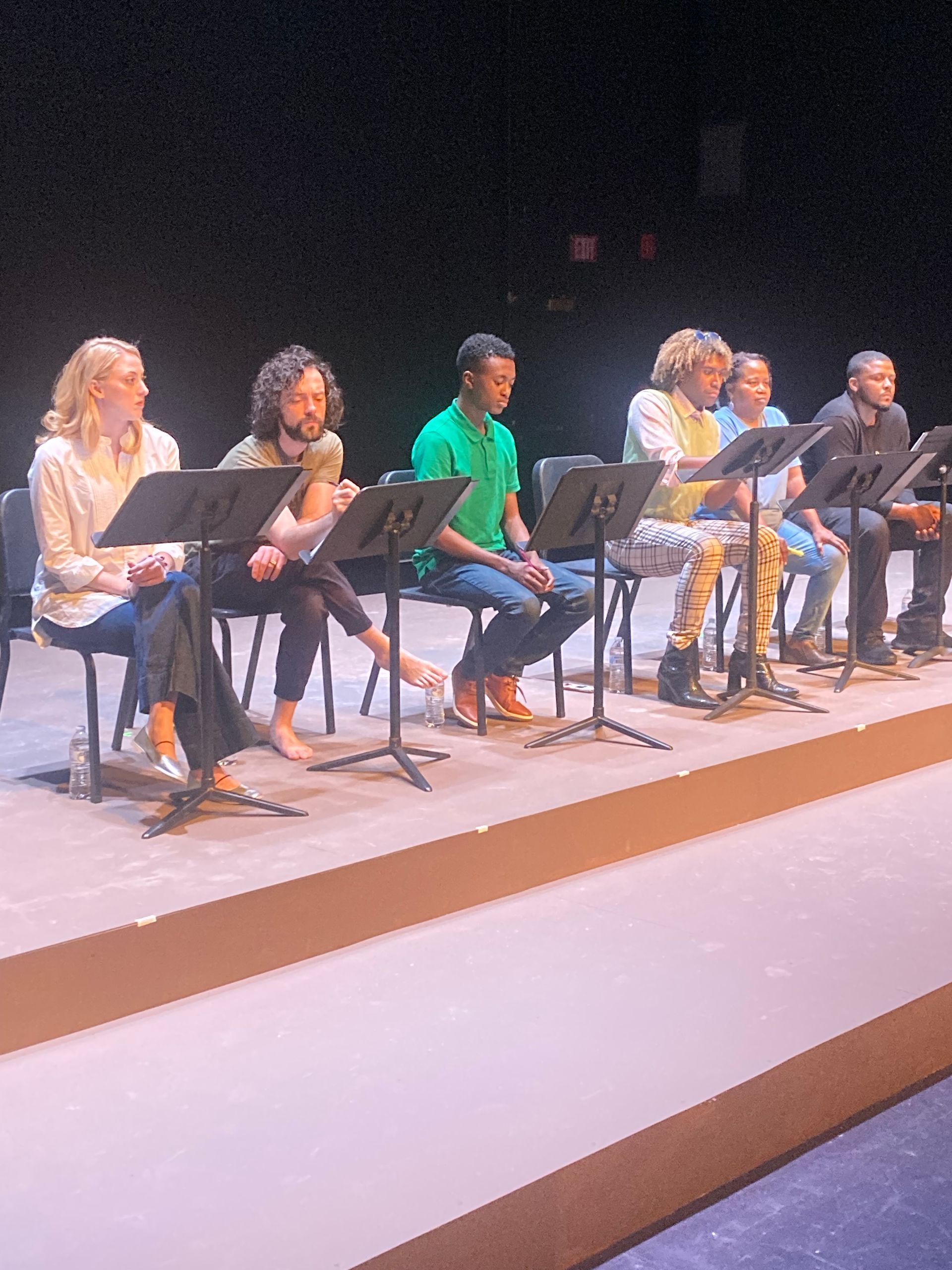Caitlin McAvoy, Samuel Camp, Sean Johnson, Jónel Jones, Dina McIntosh, Ian Payton and (not pictured) Gwendolyn Thompson Poole rehearsing Challenging Brown by Cris Eli Blak, directed by Stephanie Sandberg. Photo by WR Duell.