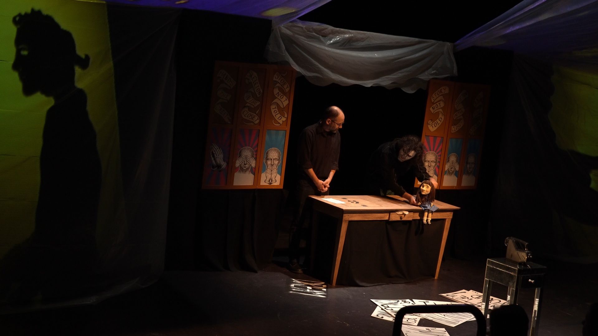 Reverie Puppets' Owen Collins and Sam Camp performing in the August 9, 2025 performance of IN BETWEEN, a devised puppet play which was co-created by Camp and Collins, at the Johnson Theatre in the Lenfest Center for the Arts, Lexington VA. Photo by Sam Camp.